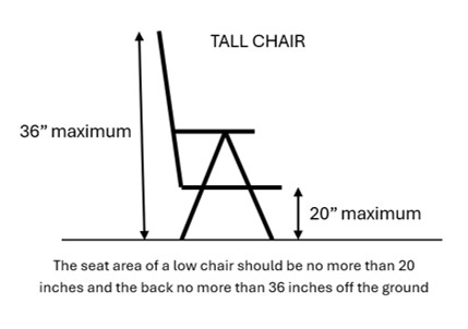 There are two types of chairs allowed at the Monte Rio Variety Show. Low style beach chairs (low chairs) and folding style camp chairs (tall chairs).